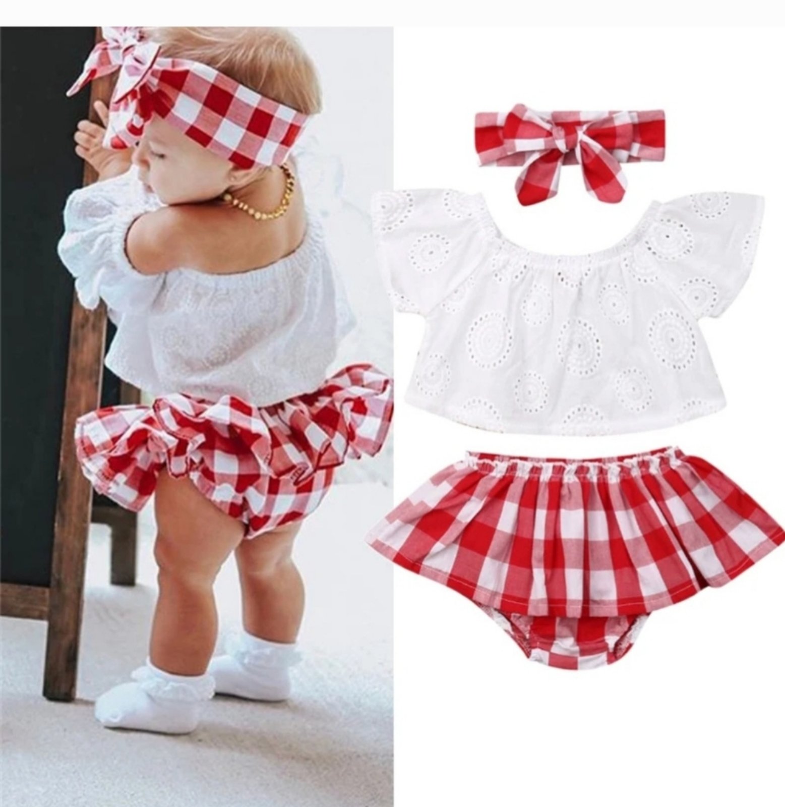 Trakica za kosu je sa lastišem, mašna se ne odvezuje. U setu su gaćice sa karnerima, bluzica sa čipkom i trakica za kosu. Čarapice su zasenba ponuda.